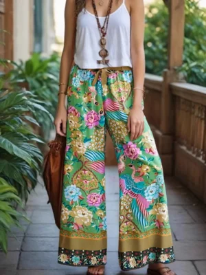 Peacock Floral Wide Leg Boho Pants